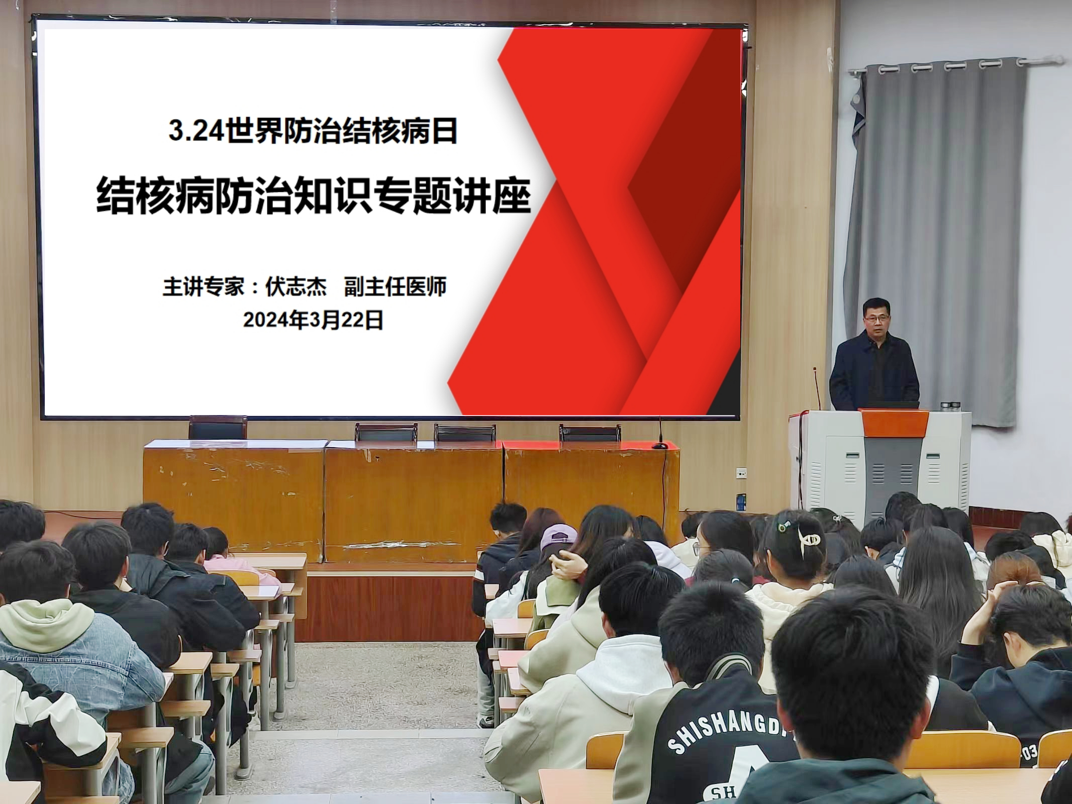 3月22日,受校医院特别邀请,商丘市胸科医院结核病专家、副主任医师伏志杰在睢阳校区为我院开展结核病防治知识专题讲座,院党委副书记蒋玉涛、校医院副院长陈亚丽、商丘市胸科医院结防科主任马琳、22级辅导员郑敏出席,各年级宿舍长和学生代表共计180余人参加。