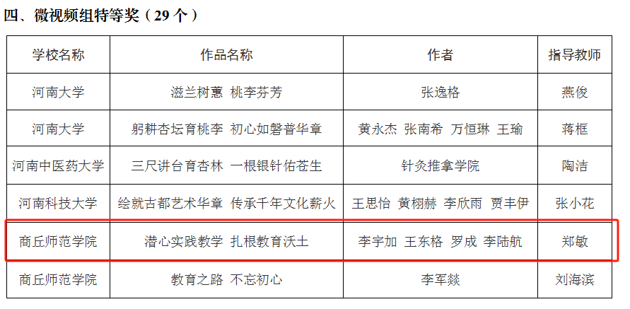 郑敏老师带领学生团队制作的微视频《潜心实践教学 扎根教育沃土》获微视频类校级一等奖、省级特等奖;通信23-1班王素萍、青梦宣传中心成员汽车23-1班罗成分别获得校级征文类二等奖,我院关工委也获得业绩考核二等奖的好成绩。今年3月份,省教育厅关工委“读懂中国”活动实施方案下发以来,我院关工委广泛动员,积极组织,严格把关,前后历时1个多月,完成了作品的策划、采访、撰稿、录制、剪辑等工作。
